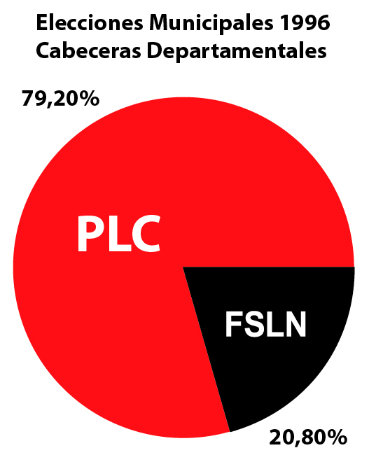 n 1996, el PLC obtuvo 11 de las 17 cabeceras departamentales mientras que el FSLN solo obtuvo 6. En el año 2000, después del pacto, el PLC solo obtuvo 5 de las 17 cabeceras departamentales y el FSLN 11. Los resultados se invirtieron en contra del PLC.