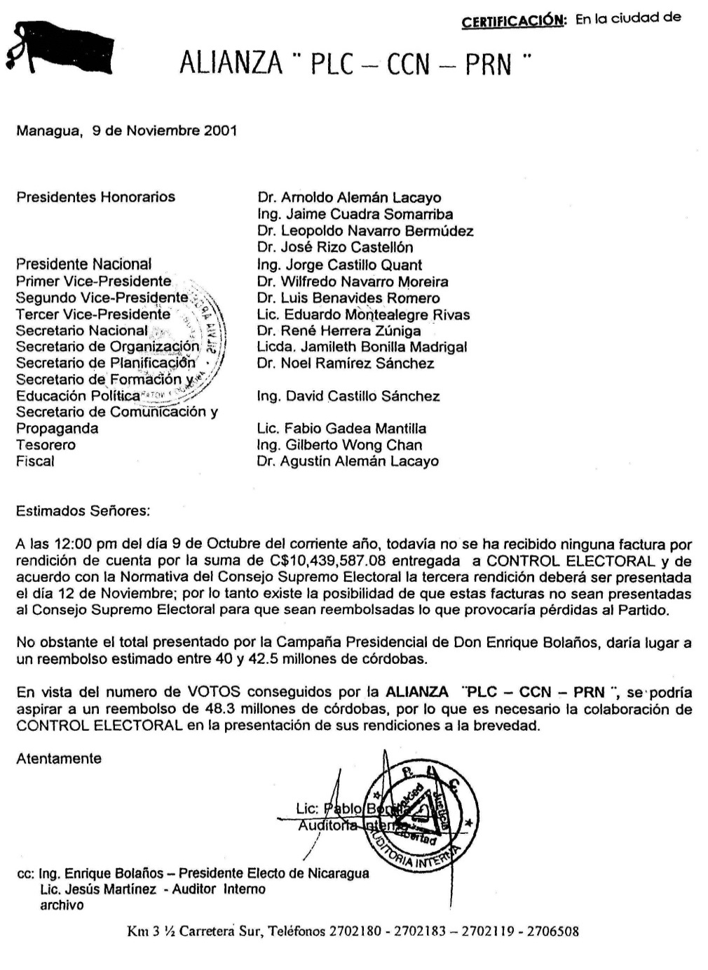 Pocos días después, don Pablo Bonilla, auditor interno de la campaña de los diputados de la Alianza PLC-CCN-PRN, en escrito fechado el 9 de noviembre de 2001 pidió al CEN del PLC que rindiera sus cuentas para presentarlas al CSE ya que a esa fecha lo presentado ha sido solo lo de la campaña presidencial del candidato a la Presidencia, Enrique Bolaños Geyer. Dijo él en el penúltimo y último párrafos de su escrito al CEN: