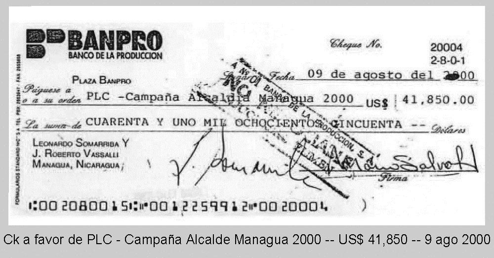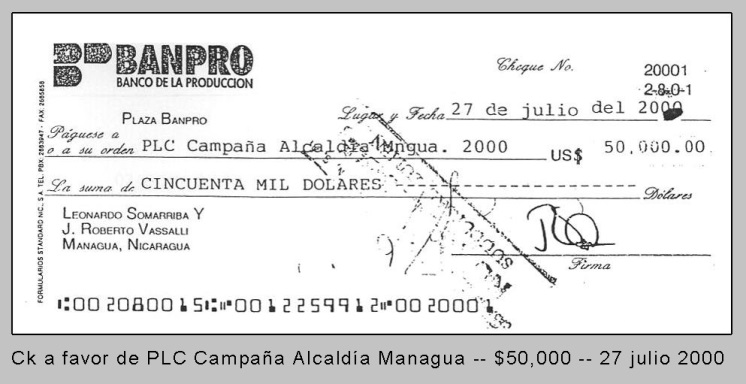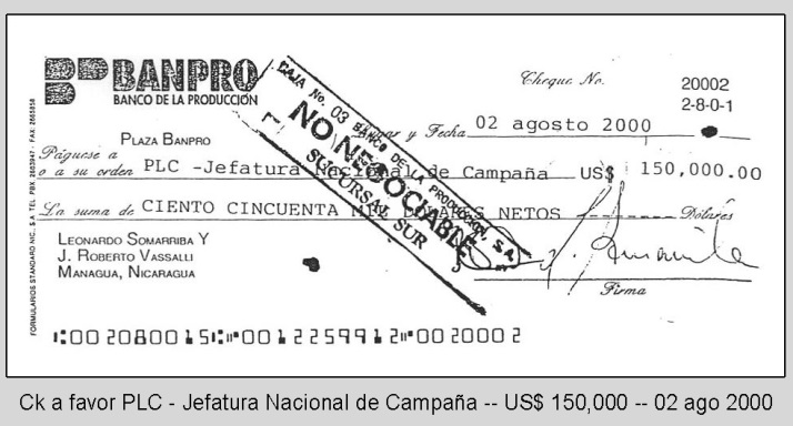 Al día siguiente, 19 de octubre de 2004, en los salones de prensa de Casa Presidencial, Leonardo (Nayo) Somarriba, tesorero de la campaña de alcaldes del PLC en el año 2000, junto con Miguel Ángel García (administrador de la campaña presidencial de Bolaños), dieron una conferencia de prensa en un salón lleno de periodistas e invitados para mostrar copias de los cheques emitidos por el PLC para financiar la campaña municipal de 2000, cuando Bolaños ni siquiera era aspirante a candidato del PLC.
