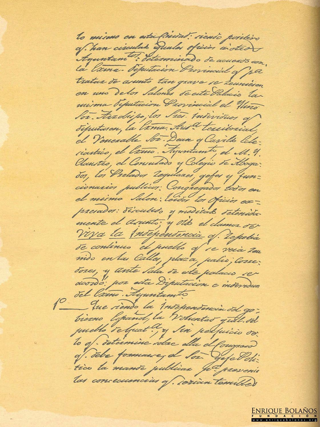En el segundo punto aceptan la independencia de España, pero hasta que estén claros y se convenzan de que será de acuerdo a los intereses de la provincia, y por eso acuerdan: 2° - La independencia del gobierno español hasta tanto que se les aclaren los nublados del día y pueda obrar esta provincia con arreglo á lo que exigen sus empeños religiosos y verdaderos intereses.12 Esgueva Gómez