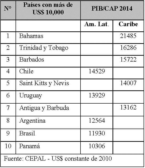 • Desde México hasta La Patagonia solo Chile, Uruguay, Argentina, Brasil y Panamá, tienen hoy un PIB per cápita de más de US$ 10,000. El de Chile, aun siendo el mayor, es menos de la mitad de lo que ya tiene  Bahamas y 25% menos de lo que tienen Trinidad-Tobago y Barbados, países caribeños.