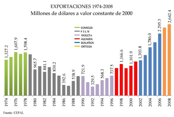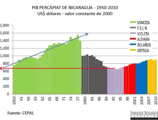 • Ese proceso marxista-leninista fue vencido por la coalición Unión Nacional Opositora (UNO)-Violeta Barrios de Chamorro en las elecciones de 1990 que forzaron las hermanas repúblicas centroamericanas junto con otras democracias occidentales. Pero desde entonces hasta hoy permanecemos estancados en un pobre desempeño económico apenas al nivel de 1955.
