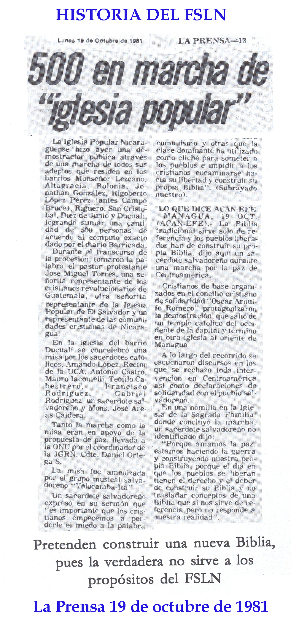El Che Guevara, pseudo-proféticamente había dicho: «cuando los cristianos revolucionarios se atrevan a dar un testimonio integral, ese día, la revolución en Latinoamérica será irreversible». Desde finales de la década de los sesenta los marxistas latinoamericanos habían comenzado a promover una estrategia que fue hábilmente usada por los sandinistas: promover una alianza con los cristianos e infiltrar la Iglesia Católica. El mismo Fidel Castro había pronosticado que no podía haber revolución sin los cristianos. En ese momento en la historia de Nicaragua, los religiosos marxistas muestran su marxismo.
