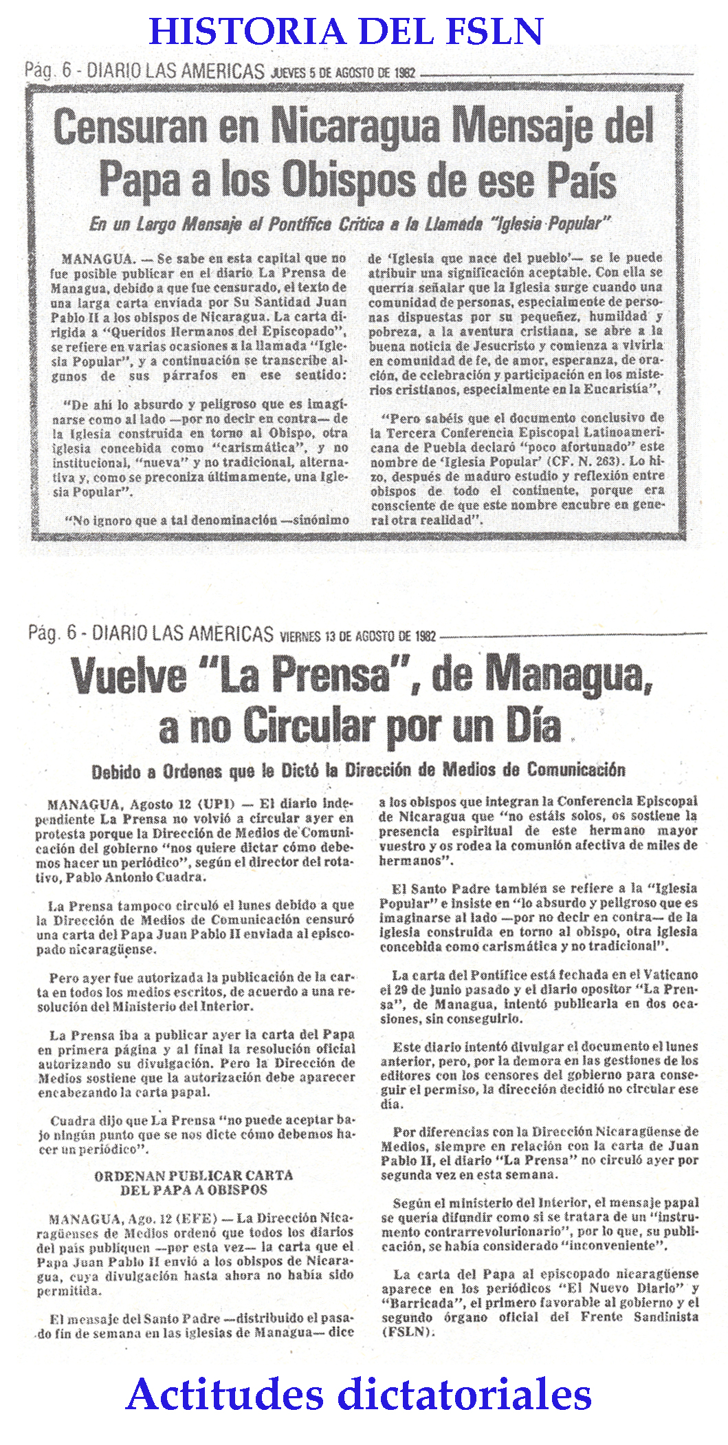 Toda la estrategia diseñada y ejecutada por el FSLN de acuerdo al modelo comunista incluye también –según especifica el manual comunista– la instauración de la llamada dictadura del Proletariado, o sea, el  control de cada ciudadano por medio de los comités de espionaje de cada barrio que bautiza el FSLN con el nombre de Comités de Defensa Sandinista (CDS) y dice que son «los ojos y oídos (espías) de la Revolución»; monopolio de los medios de comunicación (100% de los canales de televisión, 75% de las radioemisoras y 66% de los diarios, y la imposición de una verdadera censura a todo el resto); una red de espionaje interno organizado por la Dirección General de la Seguridad del Estado y reforzada con los CDS; uso de las turbas que bautiza el Comandante Daniel Ortega con el nombre «turbas divinas»; confiscaciones masivas de toda clase de bienes; control planificado de la producción y consumo; campañas de odio y persecución religiosa; juicios sumarios; etc., etc.