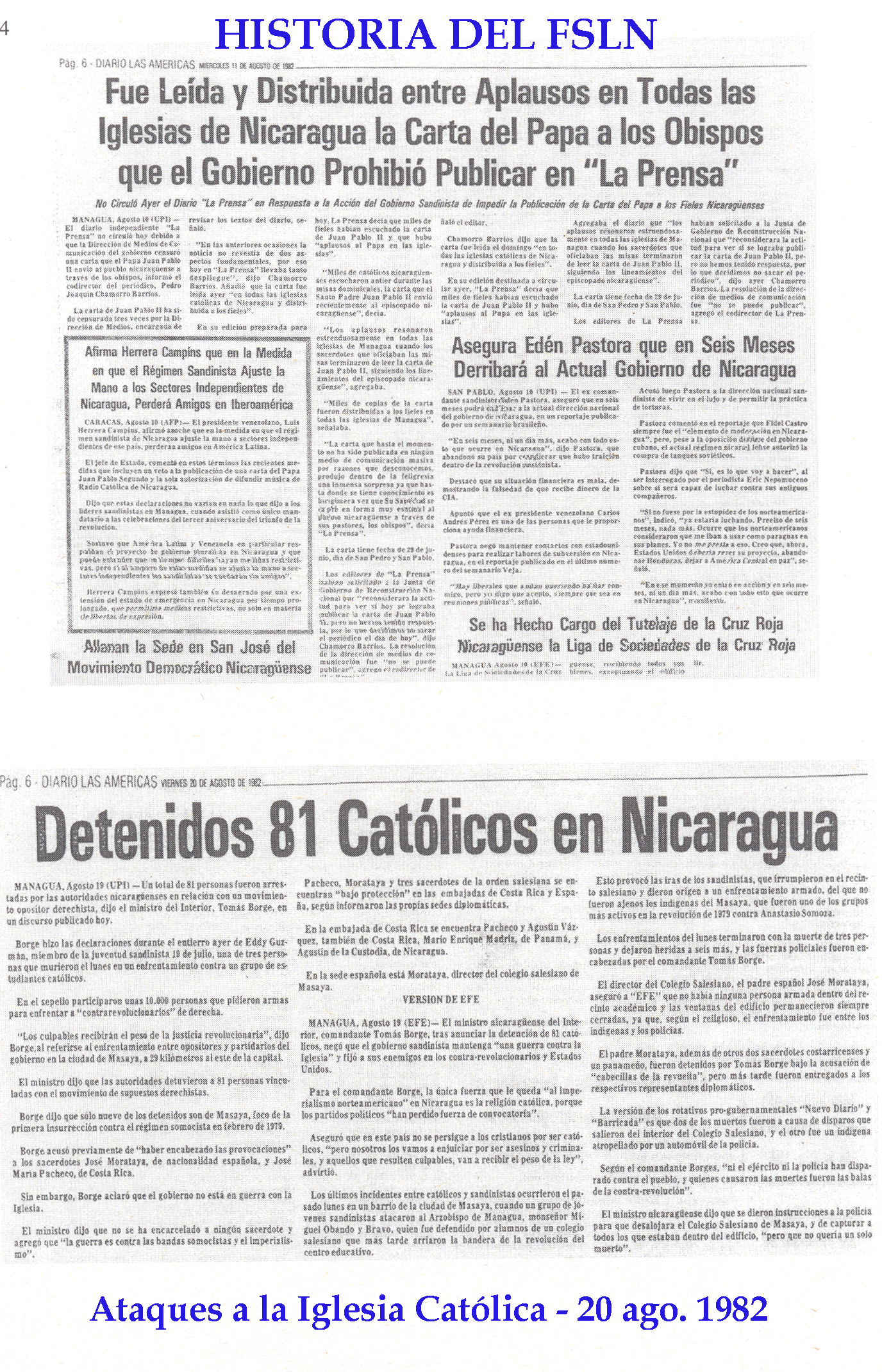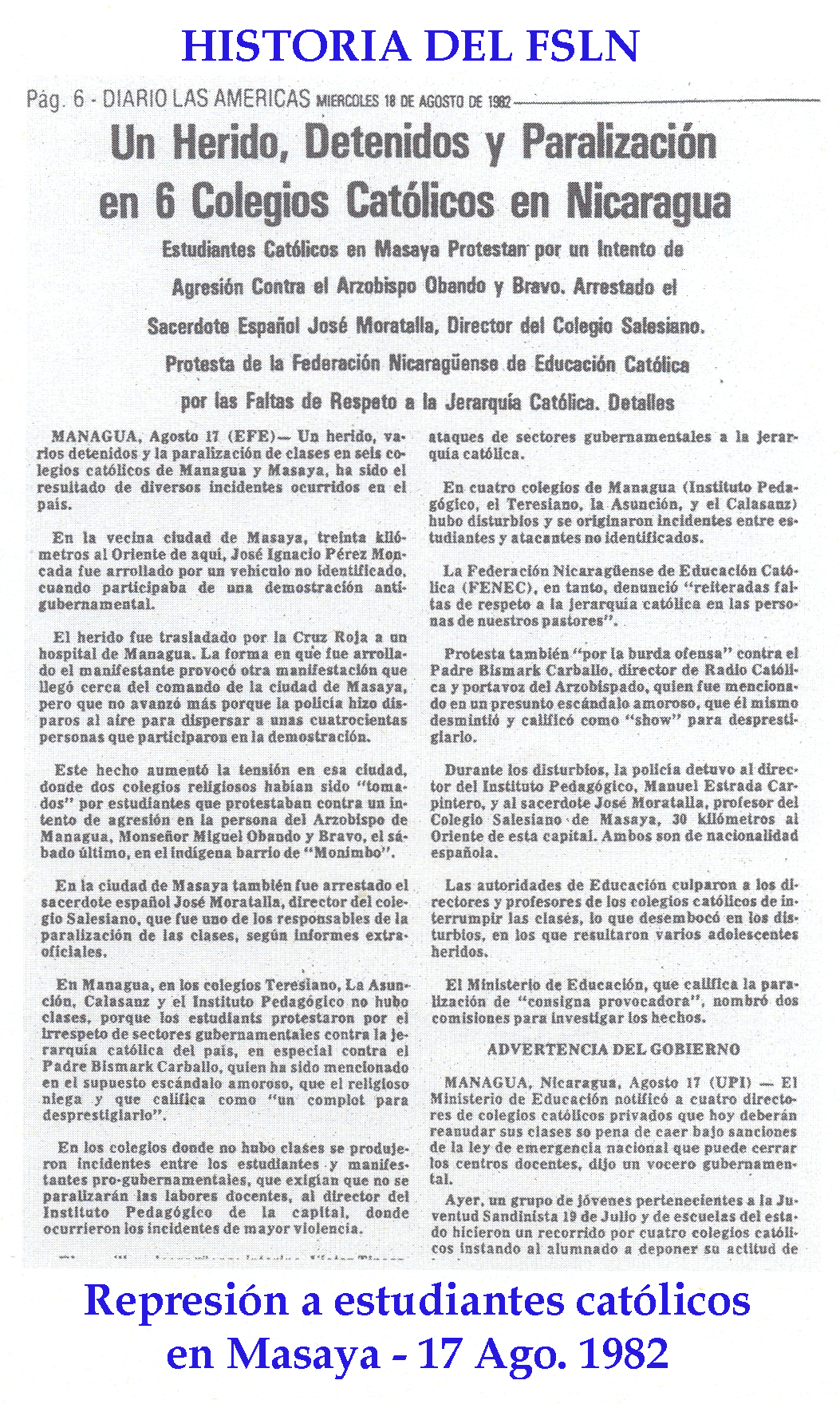 En el Colegio Centroamérica y en la Universidad Centro Americana –ambas de los jesuitas– toda una nueva generación de jóvenes sistemáticamente fue indoctrinada a favor del comunismo. Se enseñó que el capitalismo es satanás y que el redentor es la revolución. El Prefecto del Colegio Centroamérica mostraba en la pared de su despacho dos cuadros, uno de Cristo y el otro del Che Guevara, entrelazados con un letrero que decía: «Ambos murieron por la misma causa». Bajo la influencia y guía de los jesuitas, numerosa cantidad de jóvenes se dedicaron a las actividades sandinistas.