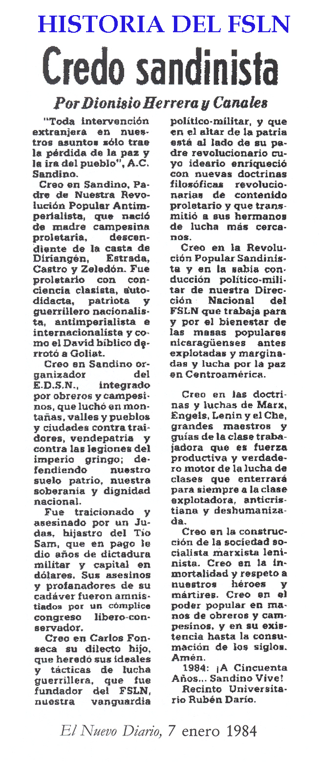 Decíamos que el Marxismo-Leninismo es la doctrina científica que guía nuestra Revolución, el instrumento del análisis de nuestra Vanguardia para entender su proceso histórico y para hacer la Revolución; el sandinismo es la expresión concreta del desarrollo histórico de la lucha en Nicaragua, sin sandinismo no podemos ser marxistas-leninistas y el sandinismo sin marxismo-leninismo no puede ser revolucionario, por eso van indisolublemente unidos y por eso nuestra fuerza moral es el sandinismo, nuestra fuerza política es el sandinismo y nuestra doctrina es el marxismo-leninismo"