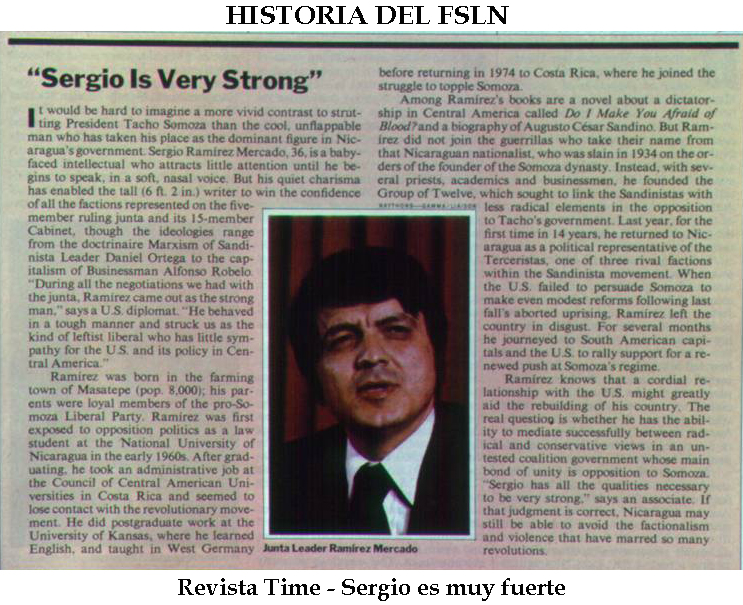 Una vez más el FSLN, en la integración de esta Junta de Gobierno, usa el juego de la caretas. La verdadera militancia e ideología del doctor Sergio Ramírez y en menor grado la del doctor Moisés Hassan permanecían escondidas. La revista Time muestra una fotografía de los cinco miembros de esta Junta, tomada recién asumen el Poder, en la que aparece el doctor Sergio Ramírez sentado en el centro. A un lado están sentados, Daniel Ortega y Moisés Hassan; y a su otro lado, doña Violeta y Alfonso Robelo. El pie de foto resume con exactitud y precisión el contenido del artículo: «El hombre de en medio». El hombre de en medio: entre los izquierdistas y los derechistas, el hombre de centro, el hombre de balance del poder. El New York Times se aventura un poco más y titula: «Los sandinistas: Patriotas primero, después quizás marxistas».