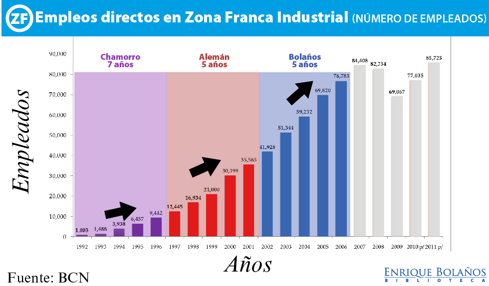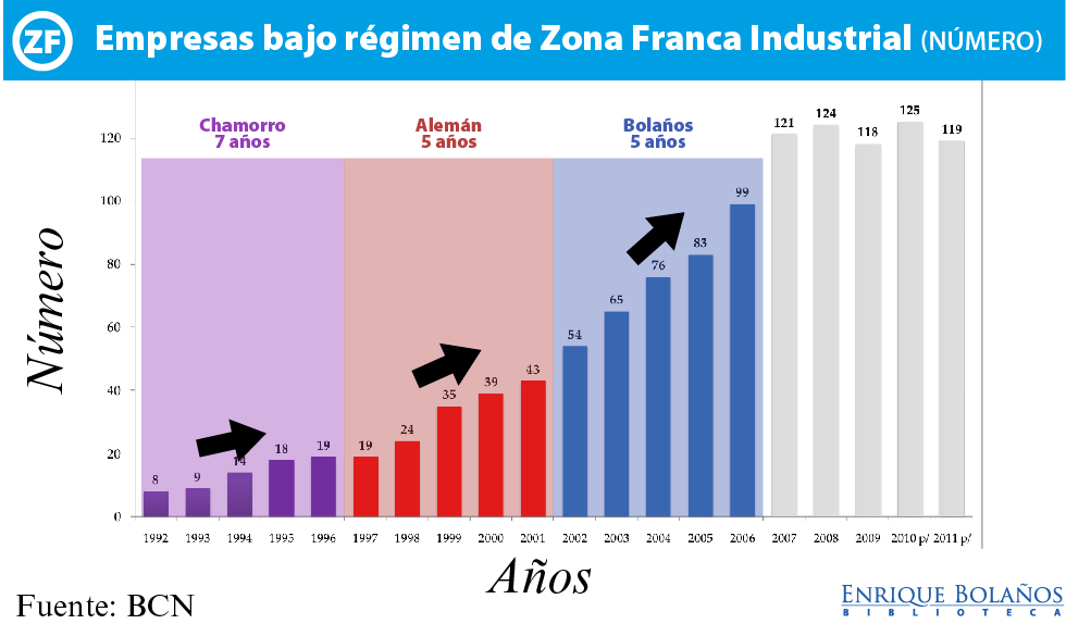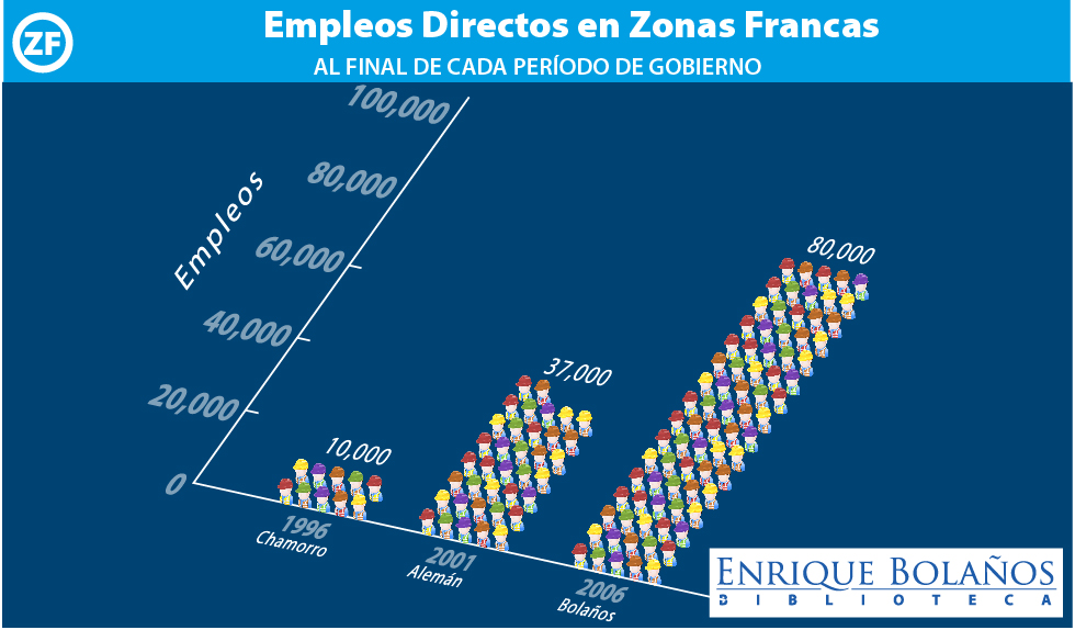 El sector de zonas francas constituye un sector importante y de gran dinamismo para la economía nicaragüense. Se ha logrado incrementar los niveles de valor agregado, lo que permite traer mayor seguridad a la estabilidad laboral y mayor productividad, a la vez que se ha ampliado la variedad de productos, reduciendo así el riesgo del sector. El fortalecimiento y crecimiento del sector de zonas francas permitió asimismo cumplir con la promesa inicial del Presidente Bolaños de generar más y mejores empleos.