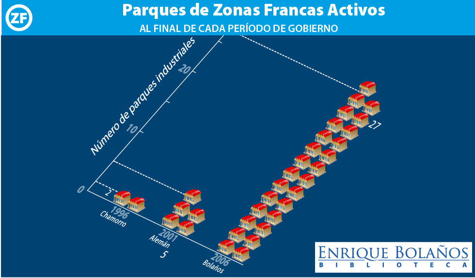 Se abrieron parques de zonas francas en muchos lugares del país, esparciendo las oportunidades de empleos para muchos: No eran parque industriales pequeñitos sino que la cantidad de metros cuadrados de techos subió de 293 mil a 870 mil metros cuadrados abriéndose en León, Diriamba, Masatepe, Granada, Chinandega, El Viejo, San Marcos, Mateare, Ciudad Sandino, Estelí, Chinandega, Tipitapa, León…