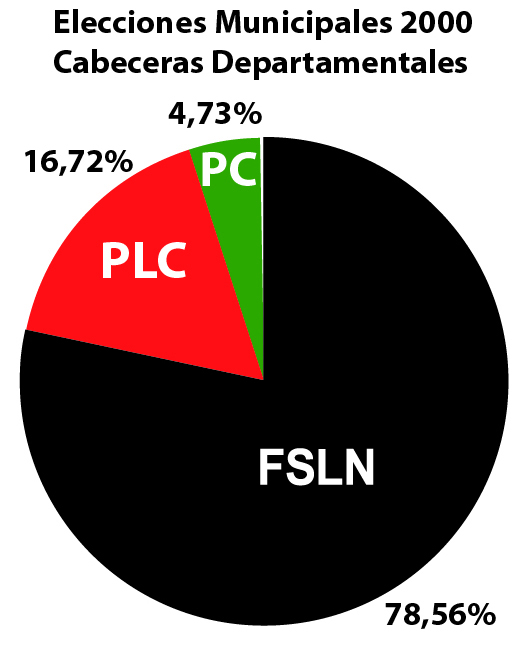 - Esta derrota fue casi solamente en las cabeceras departamentales, porque de las 151 alcaldías el PLC ganó 94 (3 más que en 1996), mientras que el FSLN ganó 52, el mismo número que ganó en 19963; o sea que los municipios pequeños, en general, votaron liberal, mientras que cabeceras departamentales —las más pobladas y más valiosas en lo económico y en lo político— en su mayoría votaron sandinista.
