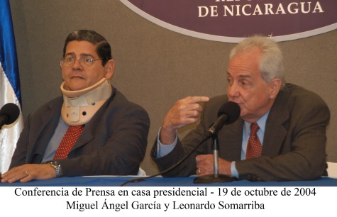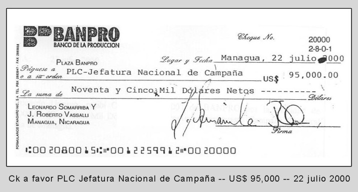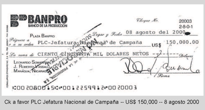 Al día siguiente, 19 de octubre de 2004, en los salones de prensa de Casa Presidencial, Leonardo (Nayo) Somarriba, tesorero de la campaña de alcaldes del PLC en el año 2000, junto con Miguel Ángel García (administrador de la campaña presidencial de Bolaños), dieron una conferencia de prensa en un salón lleno de periodistas e invitados para mostrar copias de los cheques emitidos por el PLC para financiar la campaña municipal de 2000, cuando Bolaños ni siquiera era aspirante a candidato del PLC.