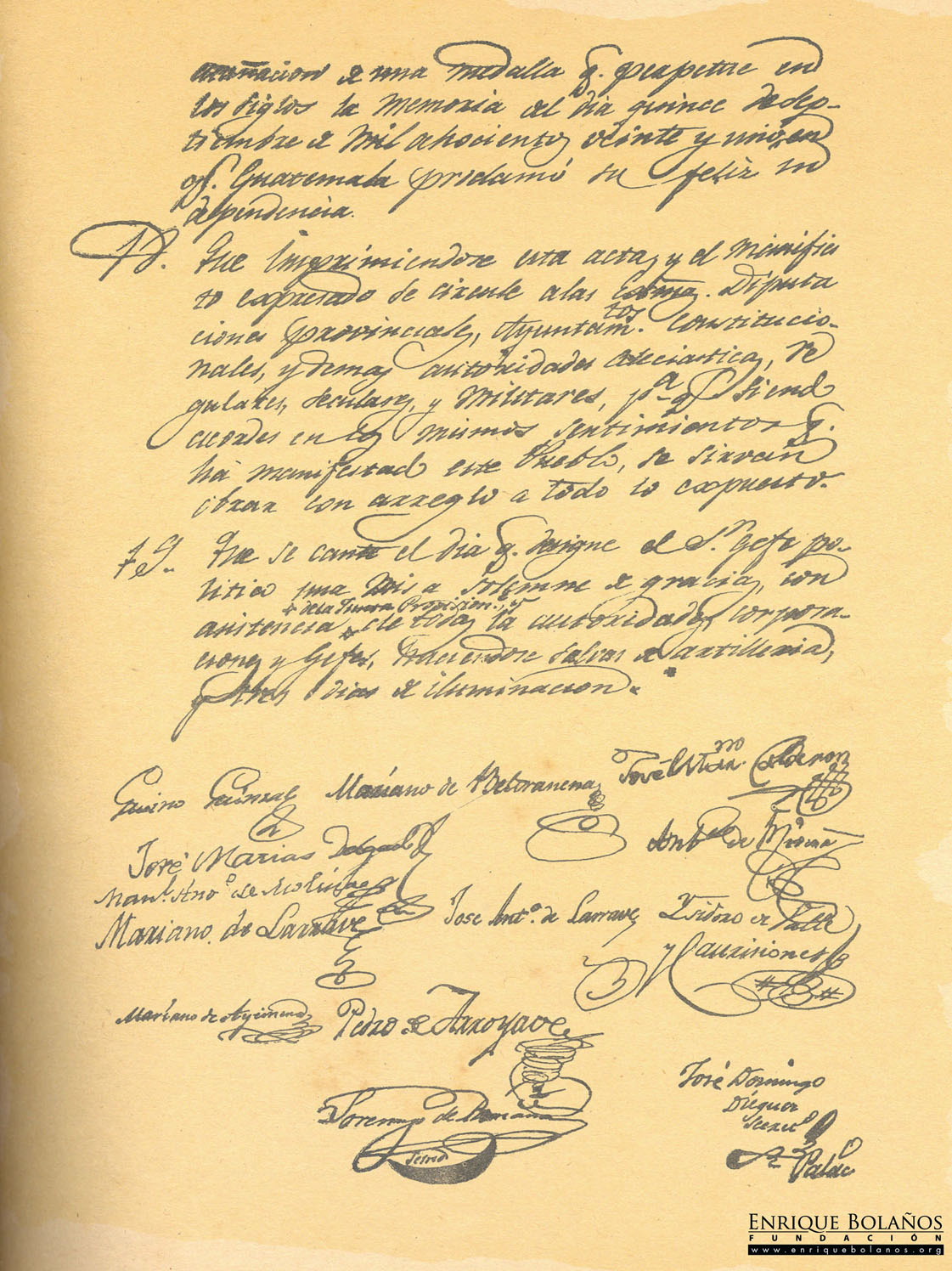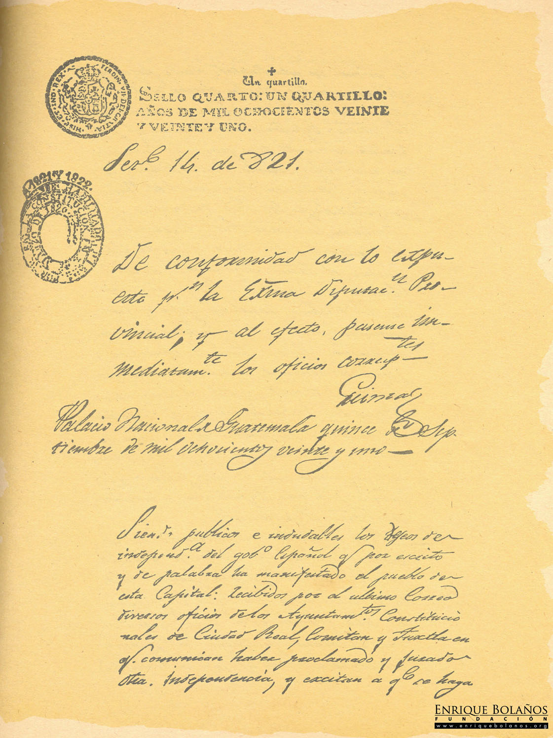 En Guatemala ―Capital del Reino de Centro-América― el 15 de septiembre de 1821 se reúne la Diputación Provincial, sin estar seguros para qué había sido convocada, y proclama la Independencia con respecto a España. No se disparó un solo tiro, ni hubo tumultos populares ni alzamientos militares.9 Álvarez Lejarza