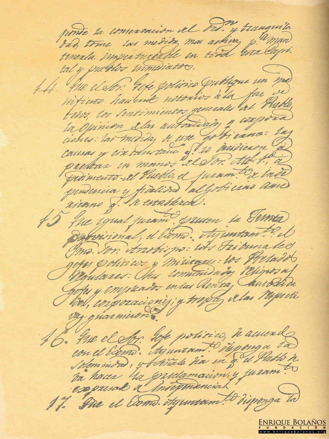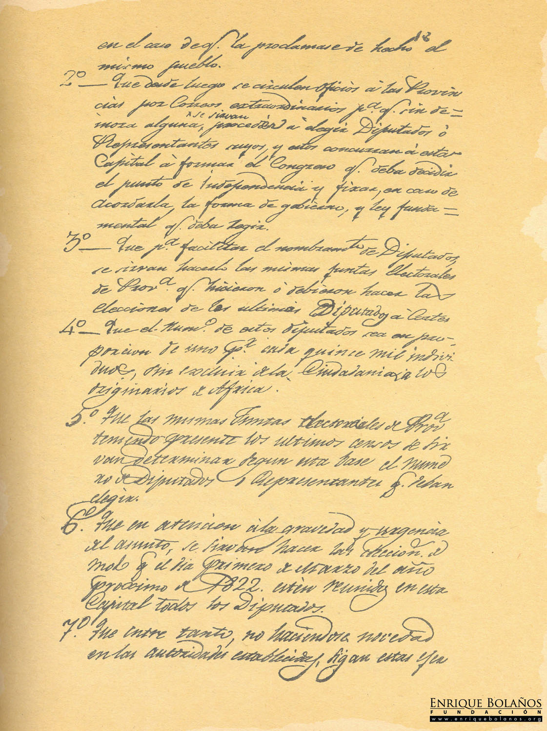 En el segundo punto aceptan la independencia de España, pero hasta que estén claros y se convenzan de que será de acuerdo a los intereses de la provincia, y por eso acuerdan: 2° - La independencia del gobierno español hasta tanto que se les aclaren los nublados del día y pueda obrar esta provincia con arreglo á lo que exigen sus empeños religiosos y verdaderos intereses.12 Esgueva Gómez
