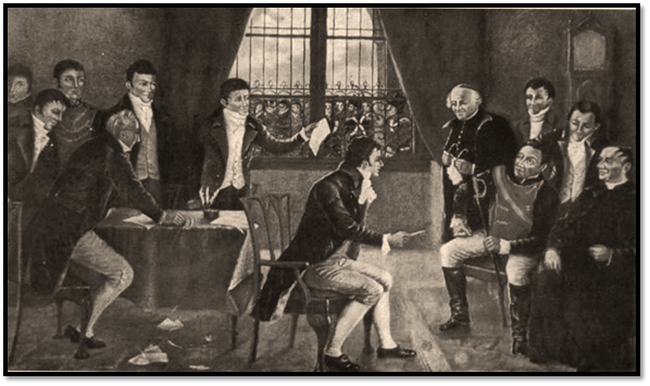 Este nuevo entorno revolucionario fue aprovechado por Napoleón Bonaparte para dar en 1799 un Golpe de Estado en Francia y el 2 de diciembre de 1804, se corona emperador, con la ambición de conquistar Europa. Es así que en 1807 Napoleón invade a España y el 4 de junio de 1808, Napoleón proclama Rey de España a su hermano José Bonaparte, mientras al destronado monarca español, Fernando VII, lo mantiene prisionero en un castillo en Francia. Se rompe así el vínculo de las colonias de América con España y esto permite que allá por 1810, en toda América nazcan brotes independentistas.