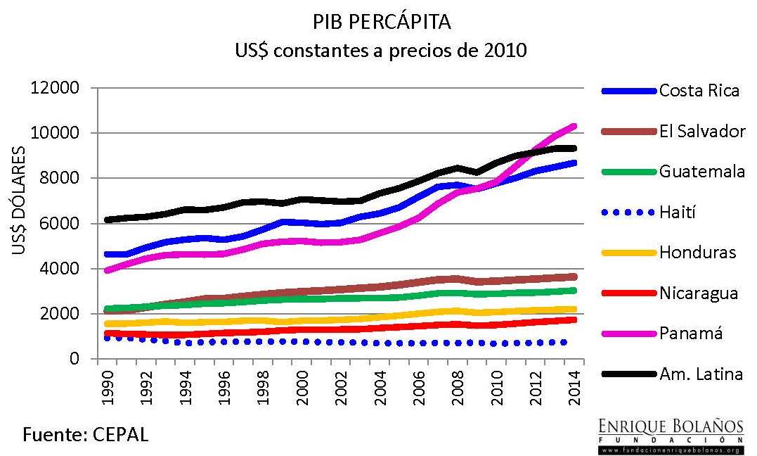 • Si vemos el PIB per cápita como índice de desarrollo o de bienestar de la población, tanto Guatemala como El Salvador, Honduras y Nicaragua estamos en los últimos lugares de América Latina. Nicaragua, en general siempre ha seguido en el último lugar (excepto Haití, que es del Caribe).