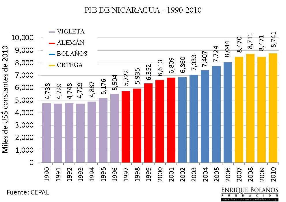 • Ese proceso marxista-leninista fue vencido por la coalición Unión Nacional Opositora (UNO)-Violeta Barrios de Chamorro en las elecciones de 1990 que forzaron las hermanas repúblicas centroamericanas junto con otras democracias occidentales. Pero desde entonces hasta hoy permanecemos estancados en un pobre desempeño económico apenas al nivel de 1955.
