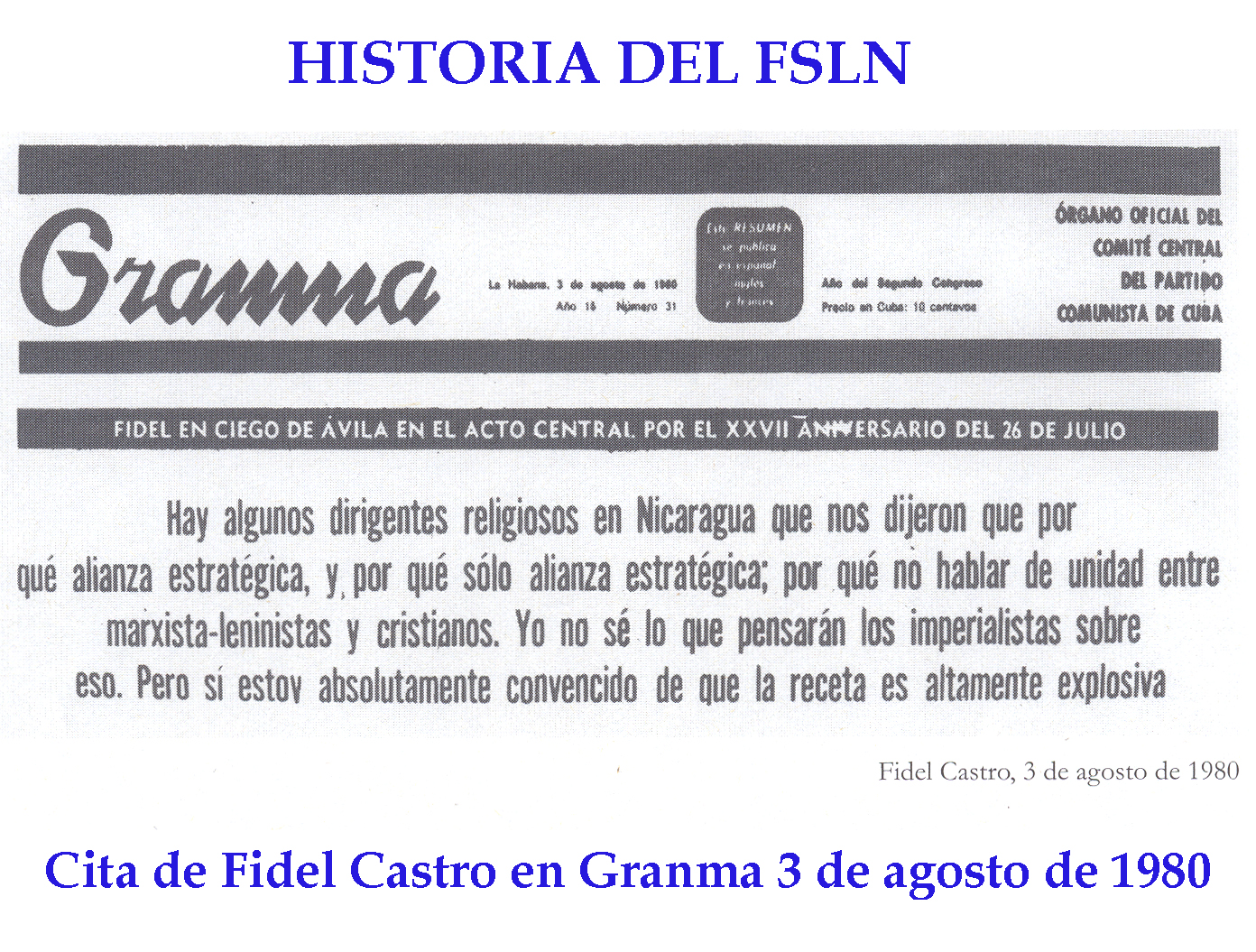 El Che Guevara, pseudo-proféticamente había dicho: «cuando los cristianos revolucionarios se atrevan a dar un testimonio integral, ese día, la revolución en Latinoamérica será irreversible». Desde finales de la década de los sesenta los marxistas latinoamericanos habían comenzado a promover una estrategia que fue hábilmente usada por los sandinistas: promover una alianza con los cristianos e infiltrar la Iglesia Católica. El mismo Fidel Castro había pronosticado que no podía haber revolución sin los cristianos. En ese momento en la historia de Nicaragua, los religiosos marxistas muestran su marxismo.
