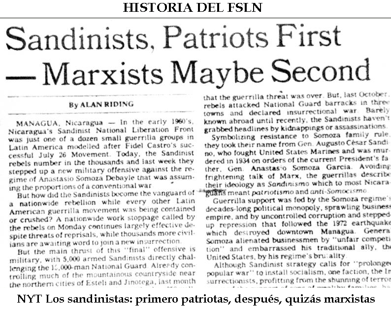 El hecho que el FSLN sea marxista-leninista ya lo conoce y acepta todo el mundo, tanto los nicaragüenses como la comunidad internacional. Ya no existe para nadie la menor duda. Hace un par de años, tratando de presentar pruebas y argumentos de que el FSLN es y ha sido siempre comunista a un visitante y escéptico congresista norteamericano, notamos que en este asunto andaba tan perdido como el hijo de Lindberg. El congresista era de aquellos que abundan y que quizás aún confunden a Nicaragua con Nigeria y cuyos conocimientos en asuntos exteriores los adquieren en la escuela de turista de México y con la lectura del Washington Post y del New York Times, pero que después de una fugaz visita de cinco horas a Managua regresan a los USA como expertos en asuntos centroamericanos, y quizás hasta latinoamericanos, toman grandes decisiones y hasta escriben libros o hasta son escogidos, por esta experiencias, como candidatos a la vicepresidencia. Pero, al poco rato de argumentar, el congresista nos aceptó los argumentos y reconoció que el FSLN es marxista-leninista. Sin embargo, dijo: ¿y qué? –como queriendo preguntar: ¿qué tiene de malo ser marxista-leninista?