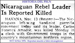 Esa fuerza expedicionaria fue dirigida desde Cuba por el Che Guevara2 e incluía en sus filas al estudiante de derecho Carlos Fonseca Amador, de 23 años, quien por error es reportado muerto en acción. Fonseca Amador nos lo narra así: