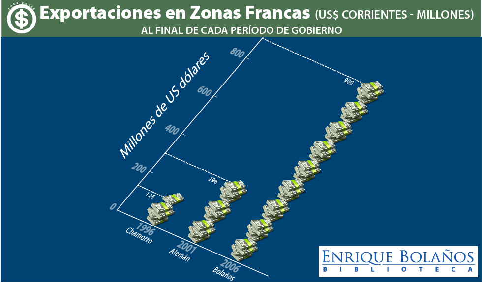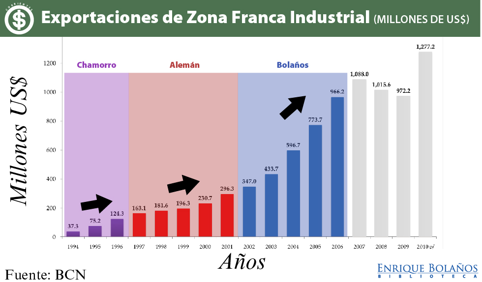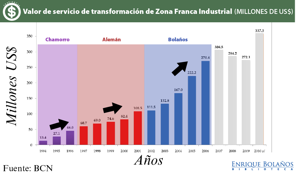 El sector de zonas francas constituye un sector importante y de gran dinamismo para la economía nicaragüense. Se ha logrado incrementar los niveles de valor agregado, lo que permite traer mayor seguridad a la estabilidad laboral y mayor productividad, a la vez que se ha ampliado la variedad de productos, reduciendo así el riesgo del sector. El fortalecimiento y crecimiento del sector de zonas francas permitió asimismo cumplir con la promesa inicial del Presidente Bolaños de generar más y mejores empleos.